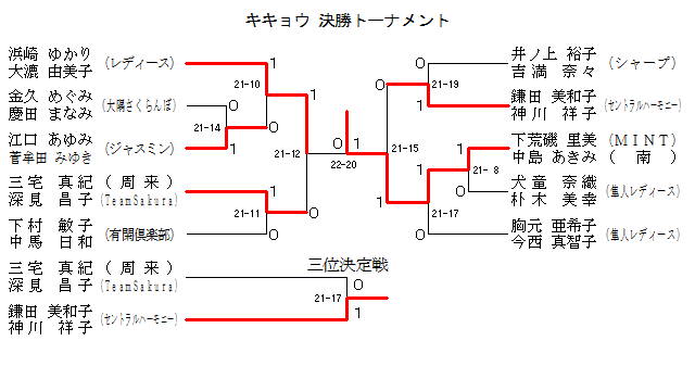 | 三宅 真紀 (周来) 深見 昌子 (TeamSakura) | ○ 22-20 | × 19-21 | ○ 21-15 | 2 |