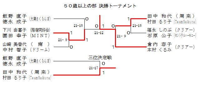 | 50歳以上の部 1ブロック | 飯野 徳永 | 福永 石原 | 上原 西田 | 山崎 中村 | 今西 朴木 | 順位 |
