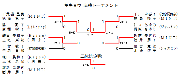 | 下荒磯 里美 穂満 寛子 (MINT) | ○ 21-11 | ○ 21-10 | ○ 21-18 | ○ 21-12 | 1 | |