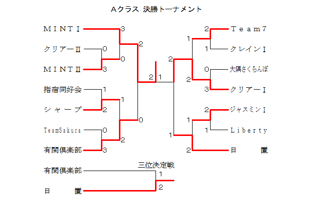 | Aクラス 3ブロック | 日置 | 南 | ジャスミンU | MINTU | TeamSakura | 順位 |