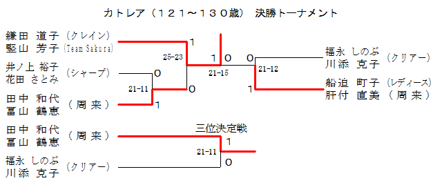 | カトレア(121〜130歳) 2ブロック | 田中 冨山 | 井手迫 上野 | 牟田神 熊丸 | 船迫 肝付 | 吉澤 豊島 | 順位 |