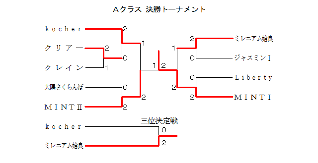 | Aクラス 1ブロック | 大隅さくらんぼ | ジャスミンU | MINTT | クリアー | 日置 | 順位 |
