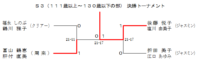| S3(111歳以上〜130歳以下の部) 1ブロック | 安田 重野 | 宿口 東上床 | 福永 鶴川 | 後藤 塩川 | 順位 |